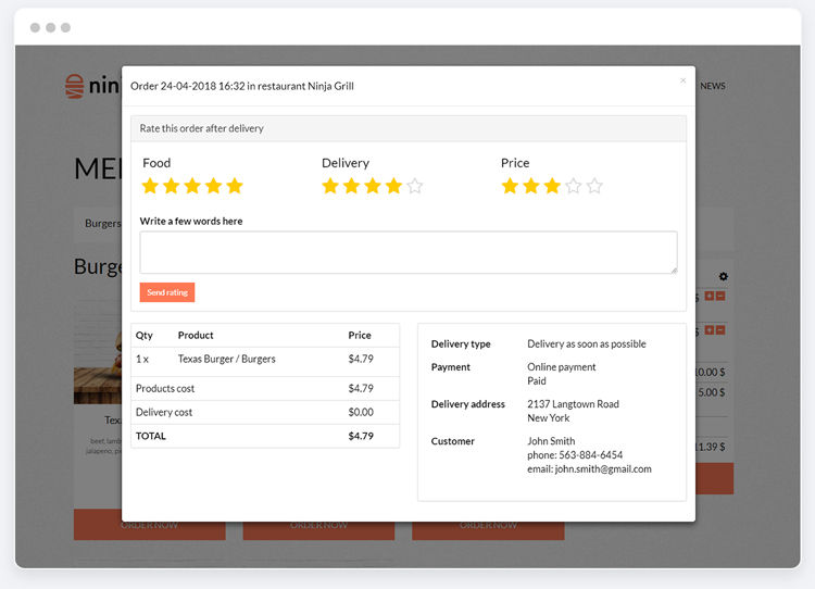 Tilastojen mukaan 94 % kuluttajista luottaa muiden asiakkaiden arvioihin. OrderApp-verkkotilausjärjestelmässä asiakkaasi voivat antaa arvion jokaisen verkkotilauksen yhteydessä.